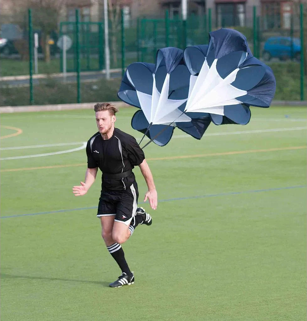 Dual parachute with padded waist belt. Improves speed and strength and provides increased resistance. Suitable for distances from 10m up to 200m